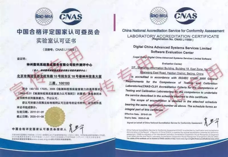 因此除了获得国家认可,此次测评中心通过CNAS的认证也相当于获得了国际权威认可机构及组织内各国实验室的正式认可!