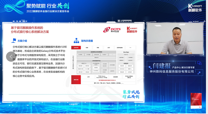 9月26日,由麒麟软件主办、以“聚势赋能 行业共创”为主题的金融行业解决方案发布会在线上举行,BB贝博艾弗森官网受邀参加。发布会上,麒麟软件重磅发布《金融行业应用解决方案白皮书》(以下简称《白皮书》),并发起成立“金融机具生态圈俱乐部”。BB贝博艾弗森官网联合共创的“基于银河麒麟操作系统的分布式银行核心系统解决方案”收录《白皮书》中,并在发布会上进行方案分享。