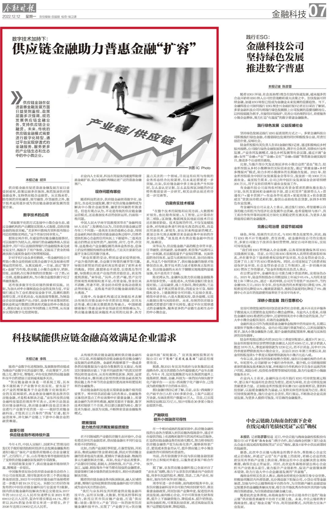 供应链金融在促进普惠金融发展方面日益受到重视,政策层面多次强调,规范发展供应链金融业务,支持供应链企业融资。从实践来看,除传统的应收融资、预付融资、存货融资之外,数字技术运用逐步成为供应链金融创新发展的重要方面。