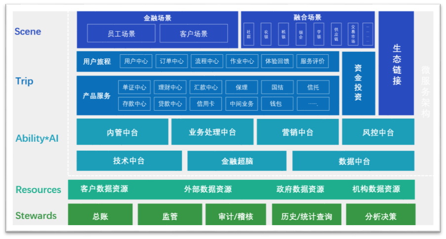 ModelB@nk5.0五层架构体系包括场景链接层、全周期旅程服务层、中台化能力输出层、数据资源积累层和体系化的组织管理层,每一层当下以及未来所要做的事情一目了然,最终实现数字化转型目标。它不仅能帮助银行实现跨组织、跨业务、跨管理、跨技术和跨能力的融合,还能帮助银行更好地开展生态场景的链接和服务的融合,比如通过社群、农银、税银、银企、供应链等场景接入,推动银行服务实体经济能力的下沉,满足用户需要,服务产业发展。而且,基于数据要素进行银行数据资产的管理和服务,需要相匹配的数字技术能力。ModelB@nk5.0将微服务理念融入中台建设,可实现多维能力的灵活组合,满足敏态创新需求。自带云原生基因,可支撑多云技术路线,并满足国家信创安全的要求。
